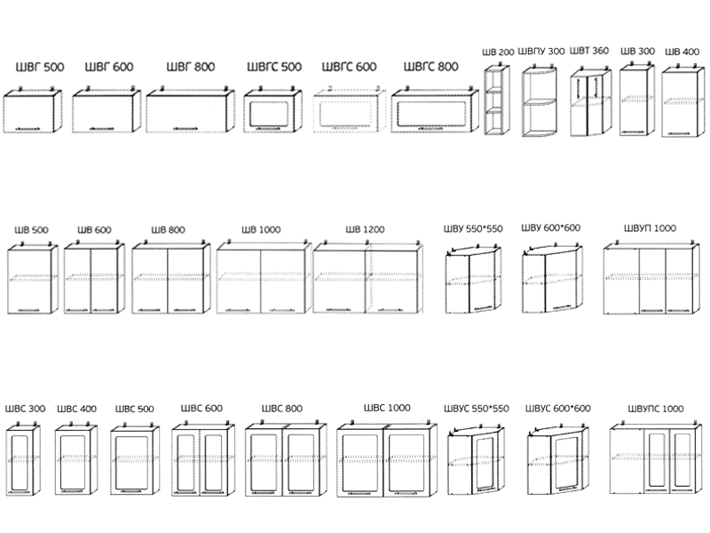 Модульная система - можно составить кухонный гарнитур в любой комплектации. Возможные варианты модулей (шкафов) смотрите на прикрепленных схемах. Стоимость за составленный гарнитур уточняйте.