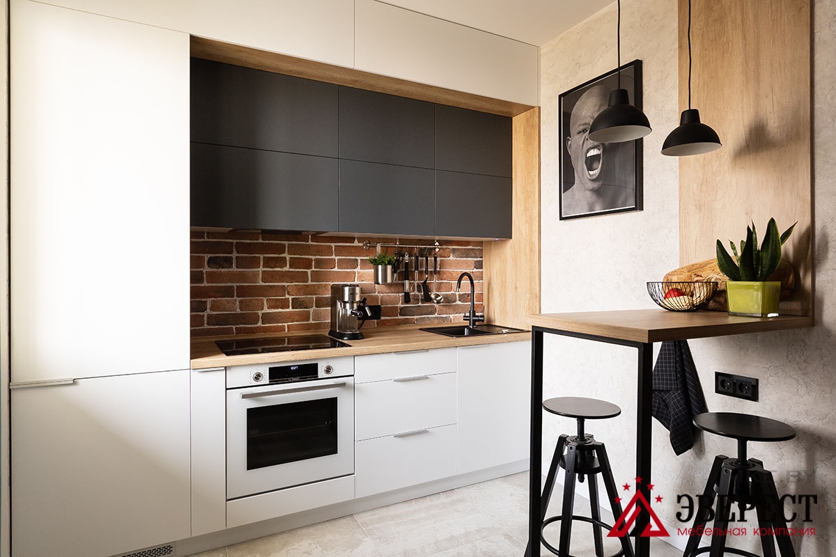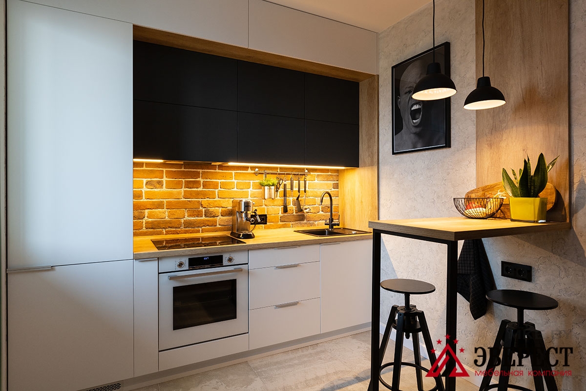 код 103826Компактная линейная кухня с белыми матовыми фасадами без ручек. Барная стойка. Подсветка. Ниши для техники.
