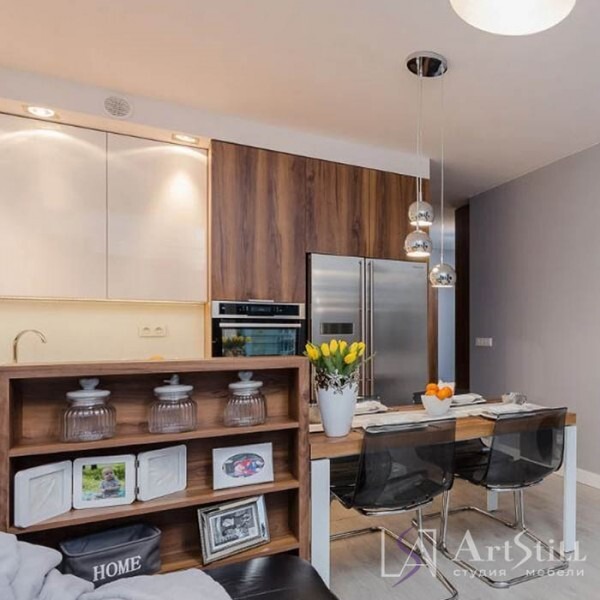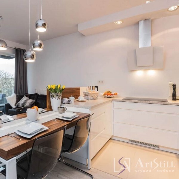 Кухня выполнена в «Современном стиле» П-образной формы. Кухня плавно переходит в стол обеденный.