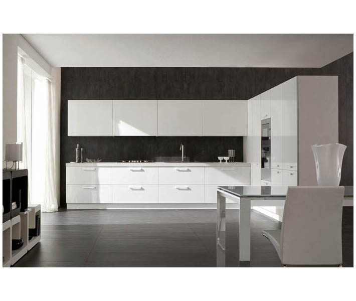Фасады данной кухни выполнены в белом цвете. Створки шкафчиков и лицевая поверхность выдвижных ящичков украшена крупными белыми ручками. Конструкция имеет нишу для духового шкафа.