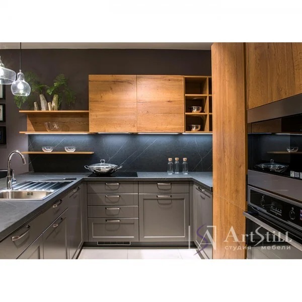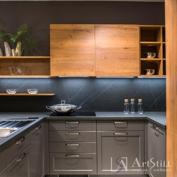 Фасады: нижние МДФ фрезерованный крашенный матовый цвет серый пыльный RAL7037;