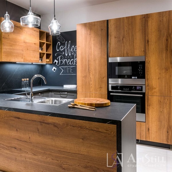 Кухня п-образная с пеналами выполнена в «Современном стиле». Дизайнерская кухня на заказ соединила в себе два стиля: современный и неоклассика.