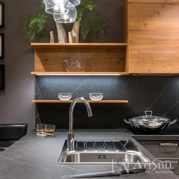Ручки –профиль в верхних ящиках цвет нержавейка фирмы Opes (Италия). На нижних фасадах ручки накладные;