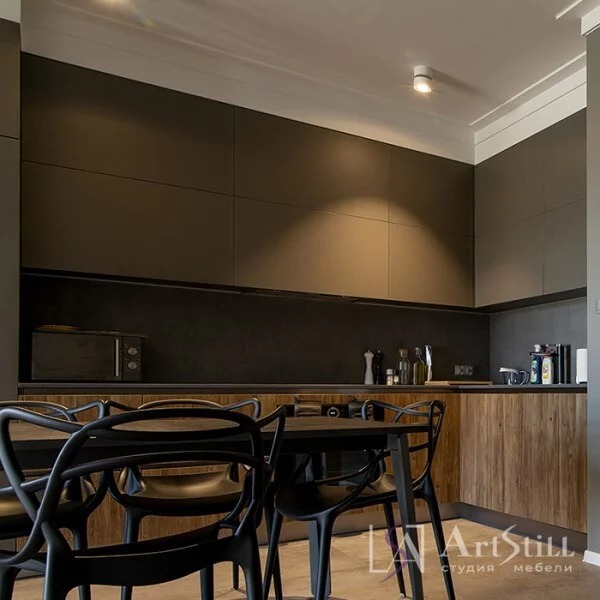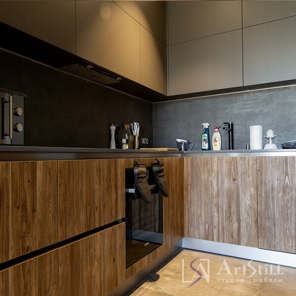 Кухня угловая выполнена в «Современном стиле». В дизайнерской кухне на заказ сочетаются два стиля – «Современный» и «Лофт».