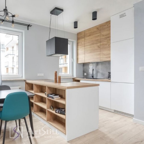 - Прямая кухня с удобным островом, на который вынесена варочная поверхность с вытяжкой. Это не только функционально, но и стильно.