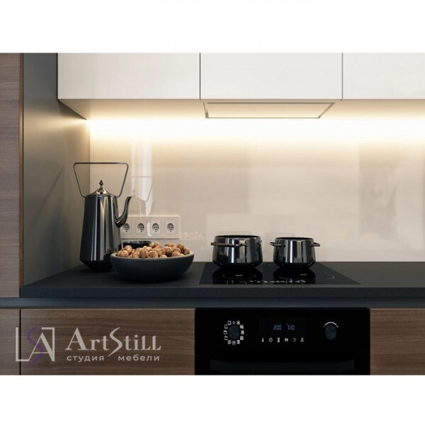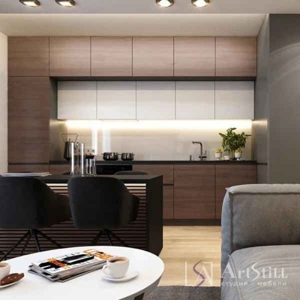 Кухня прямая с угловыми пеналами выполнена в «Современном стиле». Дизайнерская кухня на заказ не выглядит типичной кухней. О-образное расположение ящиков гармонично вписала ее в большое помещение квартиры.