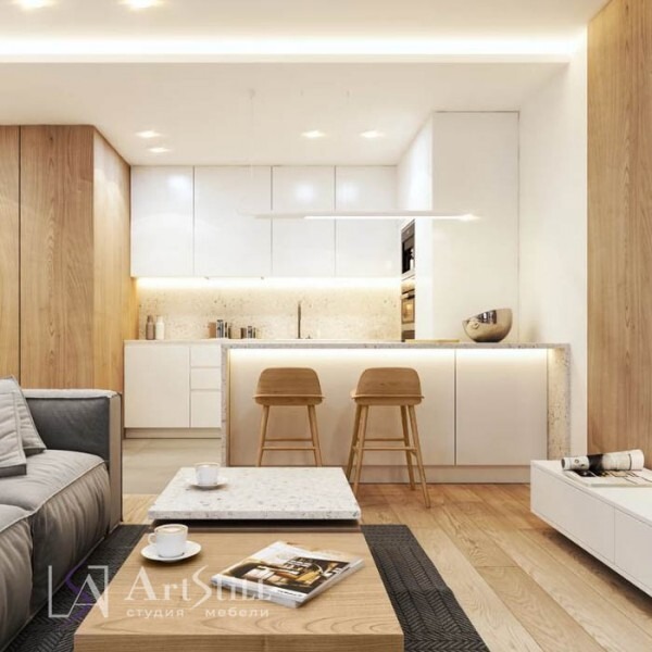 Кухня выполнена в «Современном стиле» П-образной формы с барной стойкой.