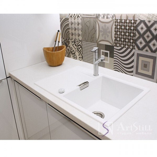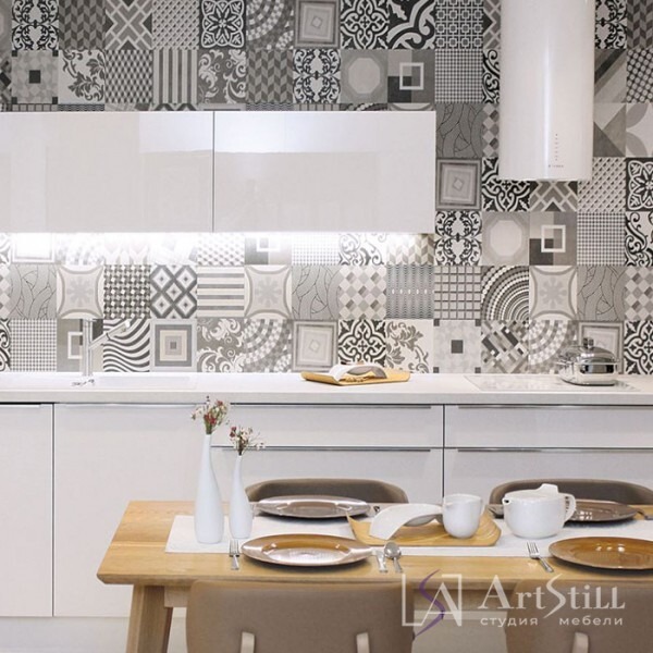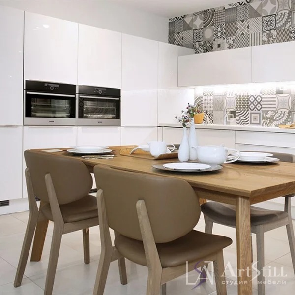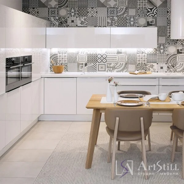 Кухня угловая с пеналами выполнена в «Современном стиле». В дизайнерской кухне под заказ весь акцент сделан на яркую и красивую плитку.