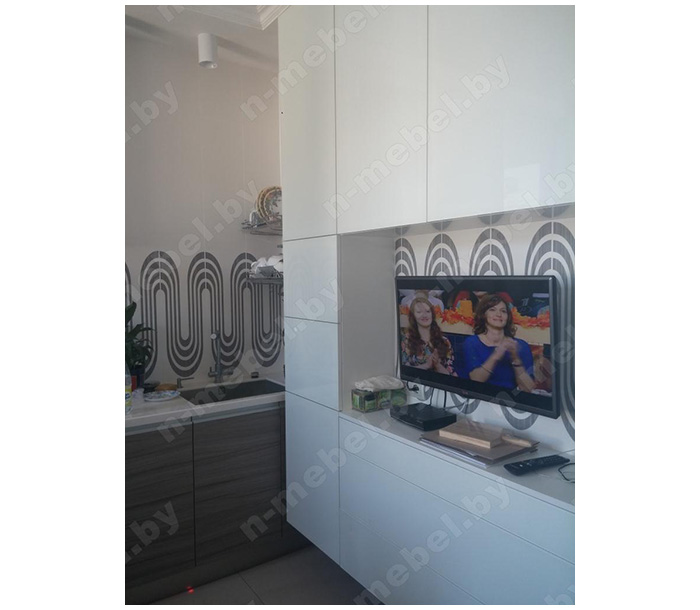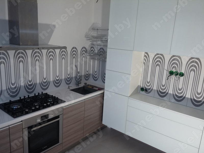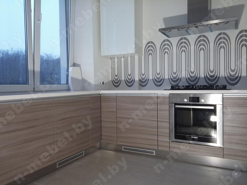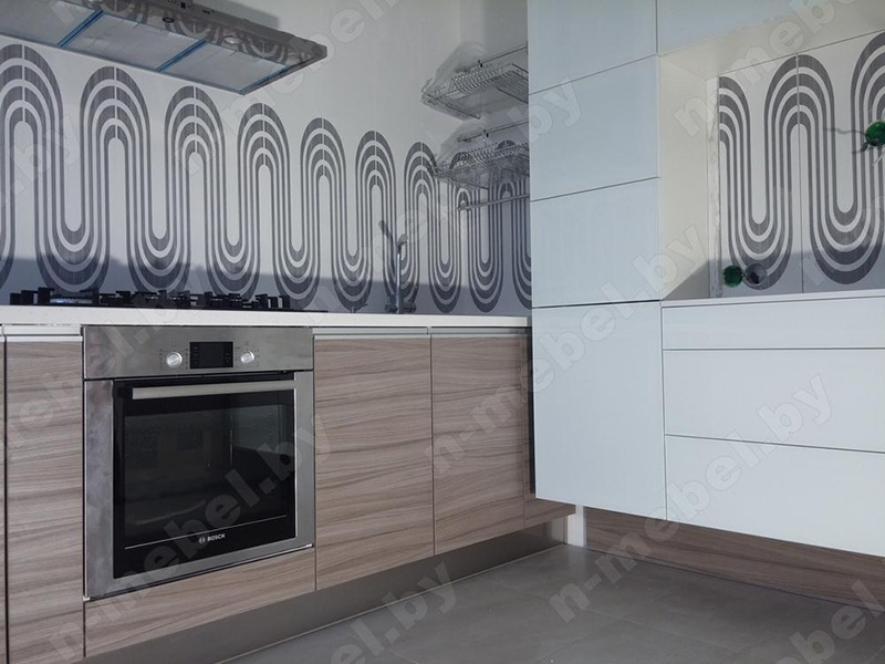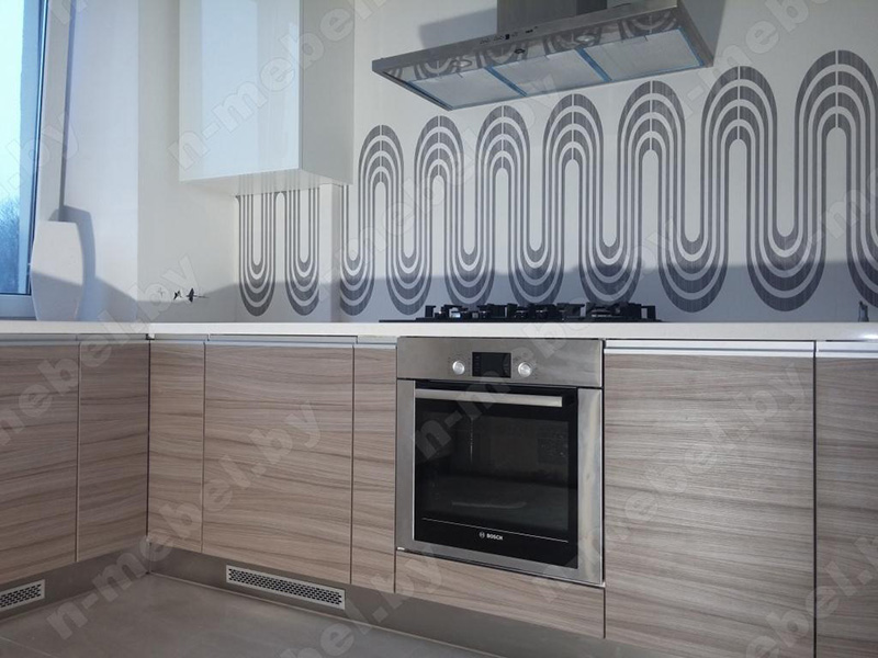 Стильная кухня изготовлена из ДСП, отличающегося безупречным качеством. Белоснежная столешница выполнена из искусственного камня, гарантирующего легкость в уходе и защиту от случайных повреждений поверхности. Створки шкафчиков укомплектованы врезными алюминиевыми ручками, удобными для постоянного использования.