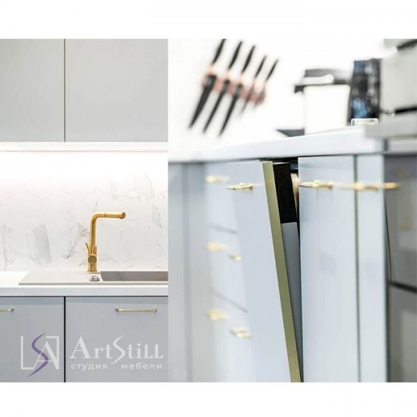 Фасады: пластик AGT серый шелк матовый. Кромка на торцах золотого цвета;