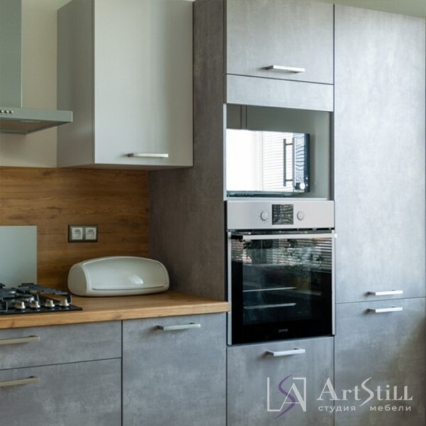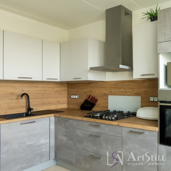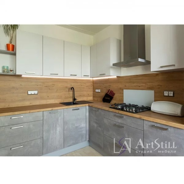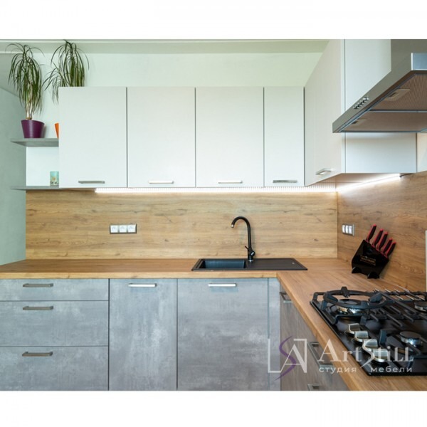 Готовый гарнитур с комбинированными фасадами из ЛДСП. Ширина кухни 140 см.