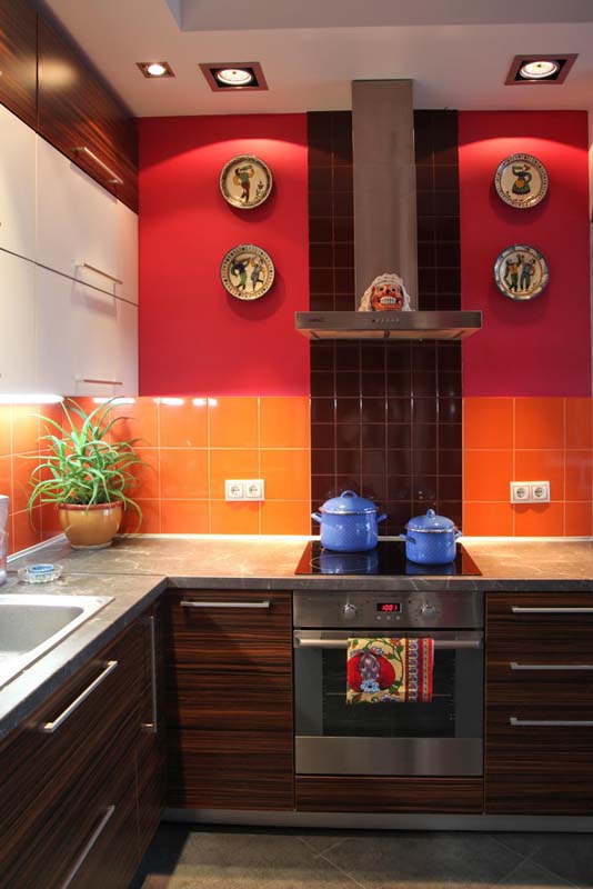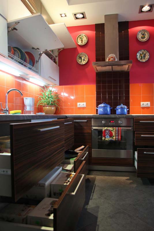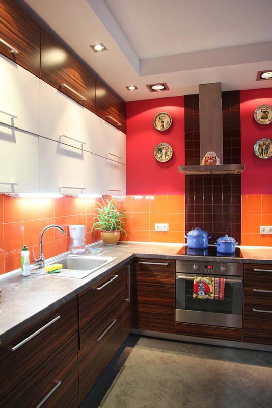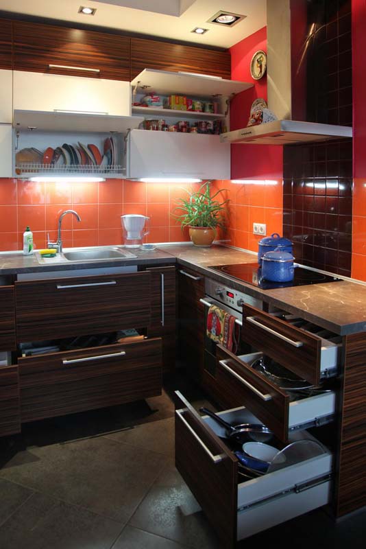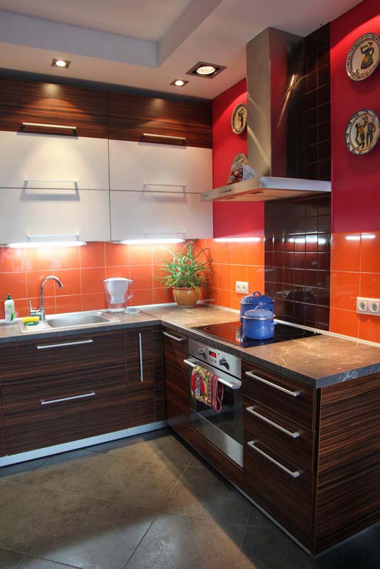 Кухня выделяется визуальным оформлением, где нашло себя сочетание современной вариации древесной текстуры ореха зебрано и глянцевого белого цвета. Подвесная секция комплектуется встраиваемой подсветкой.