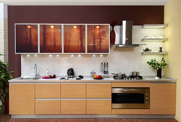 Кухня «Осень» представляет собой современный гарнитур из ламинированного ДСП. Фасады навесных ящиков декорированы интересной фотопечатью.