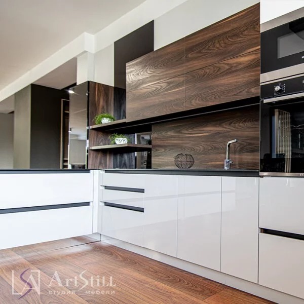 Кухня угловая выполнена в «Современном стиле». В дизайнерской кухне на заказ сочетание цветов белое и черное дополняют фасады с древесной фактурой.