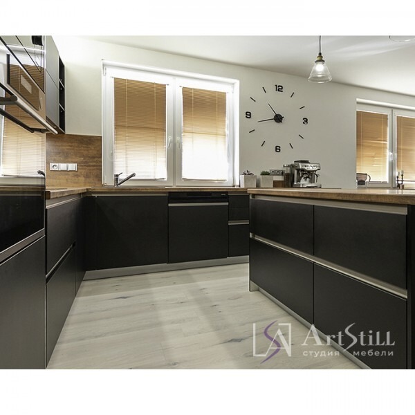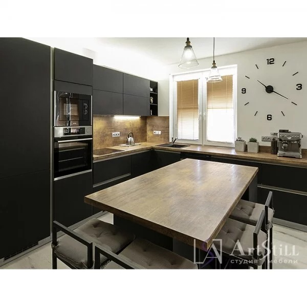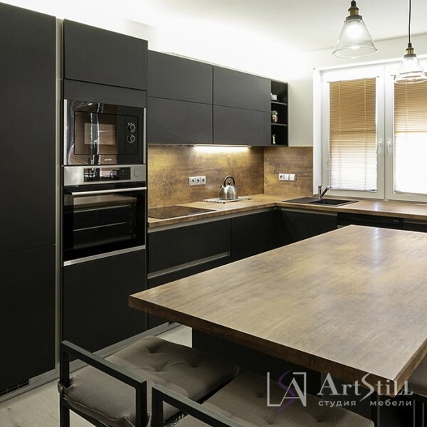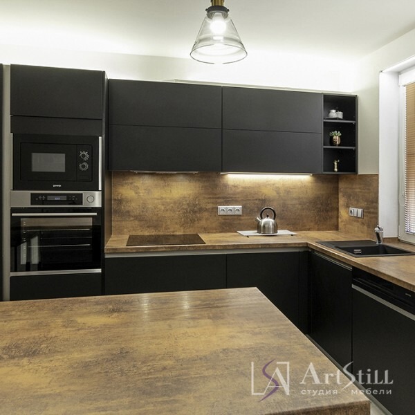 Кухня угловая выполнена в «Современном стиле». Дизайнерская кухня на заказ гармонично соединила темную фактуру фасада и ржавчину.