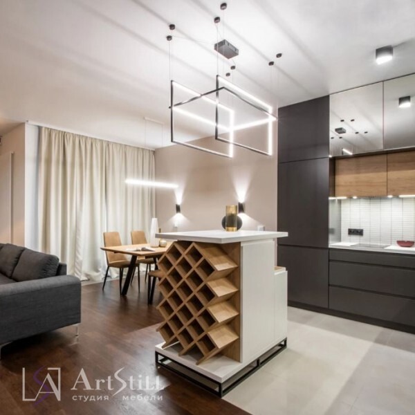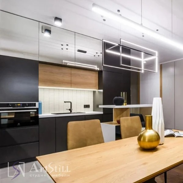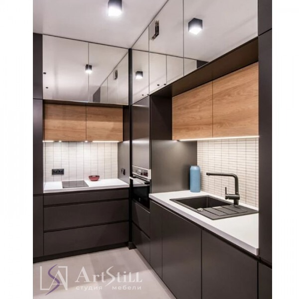 Кухня угловая с пеналами выполнена в «Современном стиле». Дизайнерская кухня на заказ соединила в себе современный и стиль лофт. Дополнительным местом для хранения являются антресоли над верхними ящиками. Фасады выполнены из зеркала, тем самым облегчают высокую кухню.