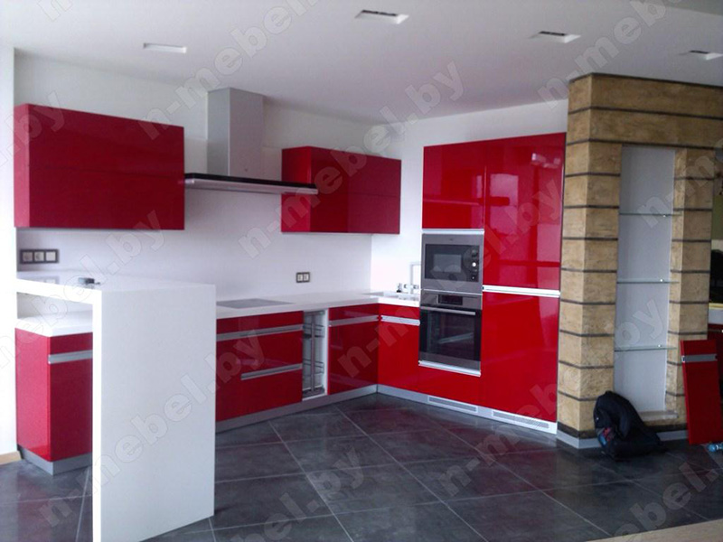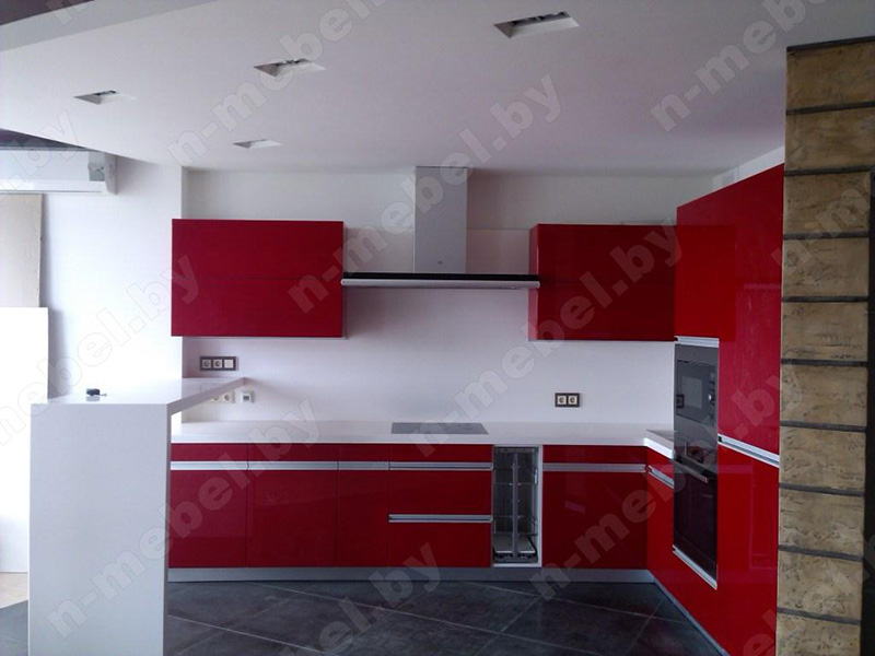 Кухня с ярко-красным глянцевым фасадом наполнит ваш дом новыми красками. Поверхность широкой белой столешницы, выполненной из искусственного камня, проста в уходе и защищена от случайных повреждений. Кухня, представленная в современном стиле, для большего комфорта оснащена небольшой стойкой, за которой можно выпить чашку кофе и даже поужинать. За счет надежных механизмов открывания створки шкафов работают плавно и бесшумно.