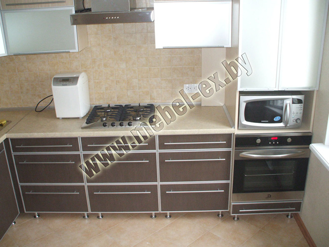 Продолговатая рабочая зона. Прямые хромированные ручки. Ниши для техники.