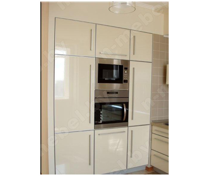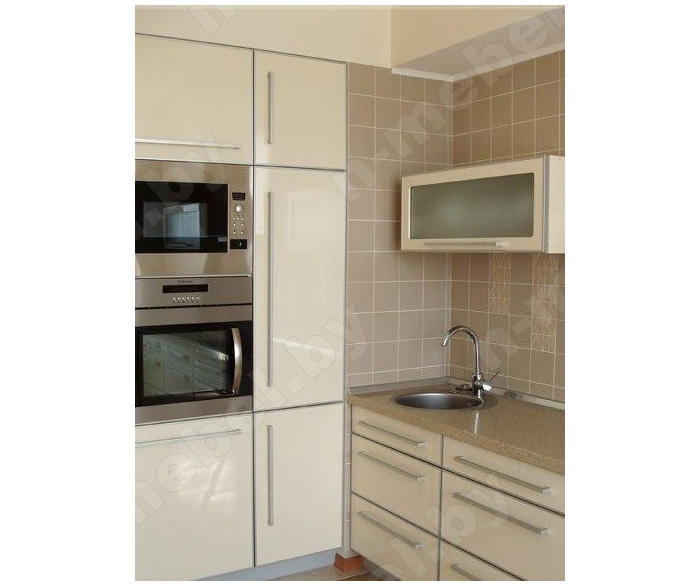 Кухня представляет собой стильную угловую конструкцию с множеством вместительных шкафчиков и выдвижных ящиков. Предусмотрено наличие открытых ниш, предназначенных для встраиваемой техники. Фасад из глянцевого пластика оформлен в алюминиевую рамку. Створки модулей оснащены удлиненными ручками, покрытыми хромом.