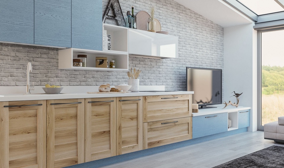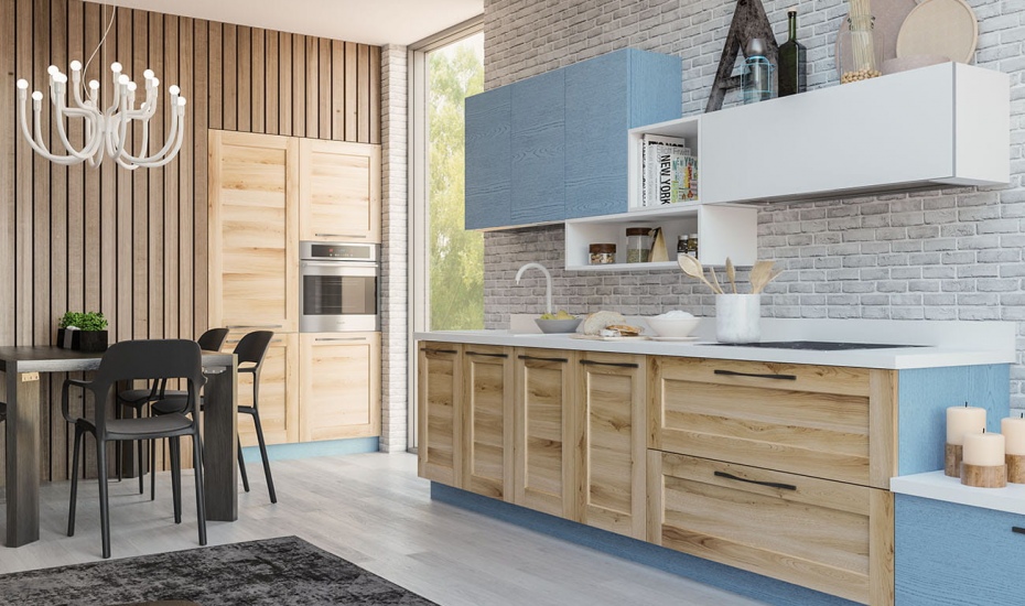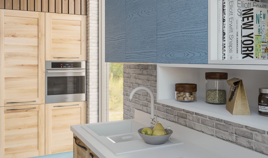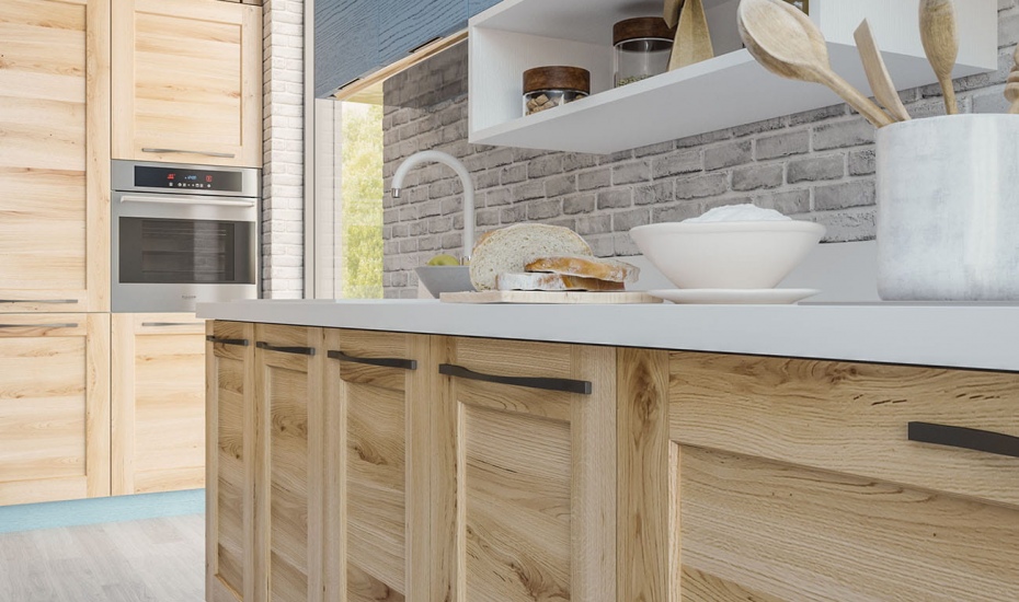 код 91543Линейный кухонный гарнитур с четкой фактурой дуба, совмещен с горкой.