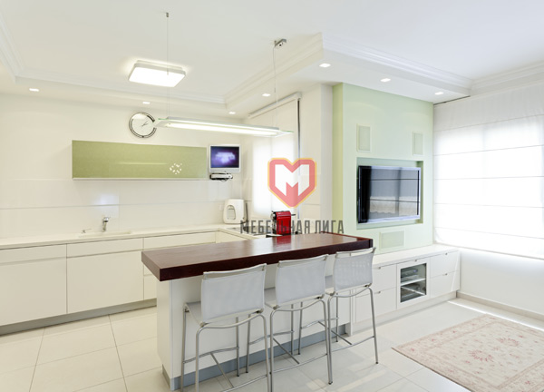 Угловая кухня выполнена в современном минималистичном стиле. Она дополнена барной стойкой, которая может играть роль обеденной зоны. Сочетание салатового и белого цветов подарит яркую атмосферу, настроит на позитивный лад. Корпуса ящиков изготовлены из ЛДСП, применяется качественная фурнитура Blum.