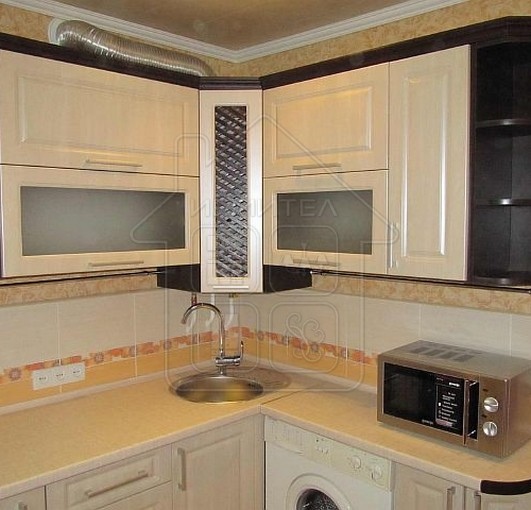 Стильная угловая кухня в полной комплектации. Фасады матовые с частичным остеклением сверху.