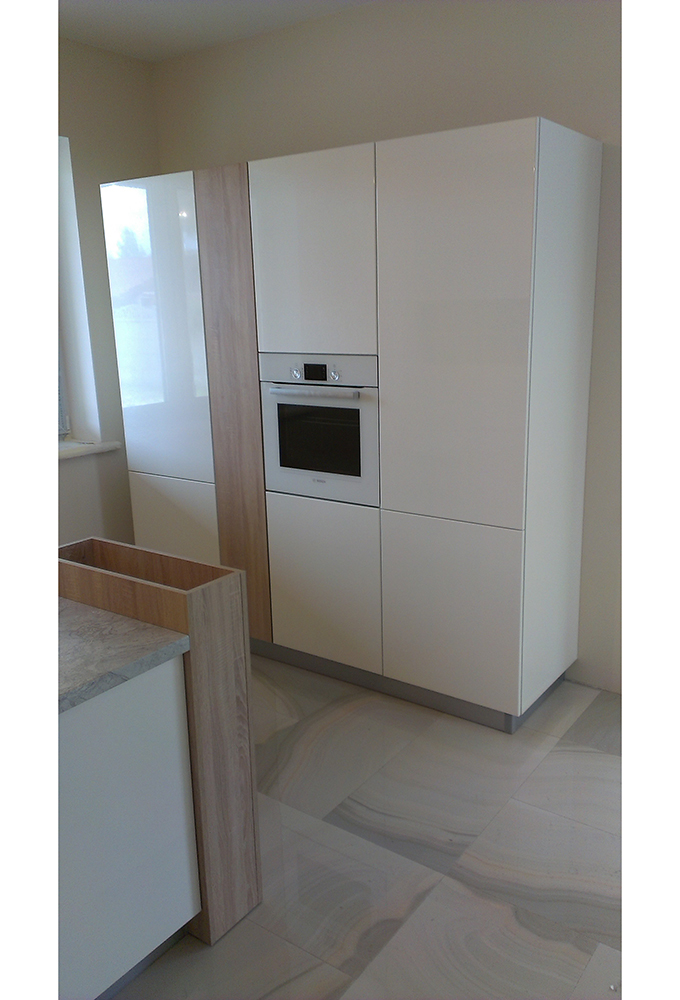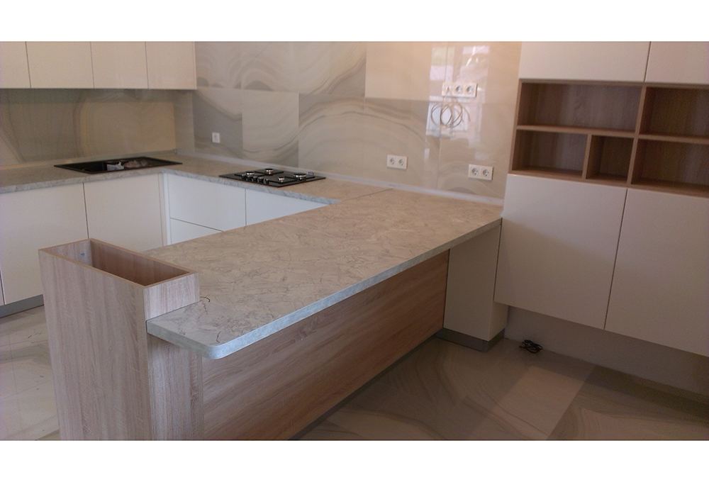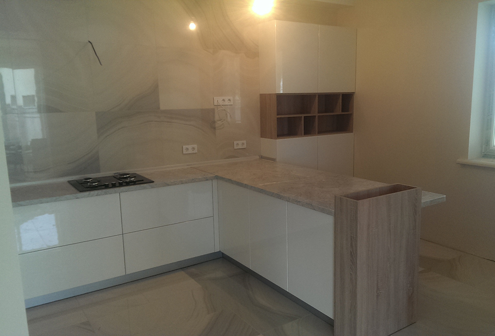 код 84861П-образная столешница. Фасады без ручек. Шкаф с открытыми нишами.