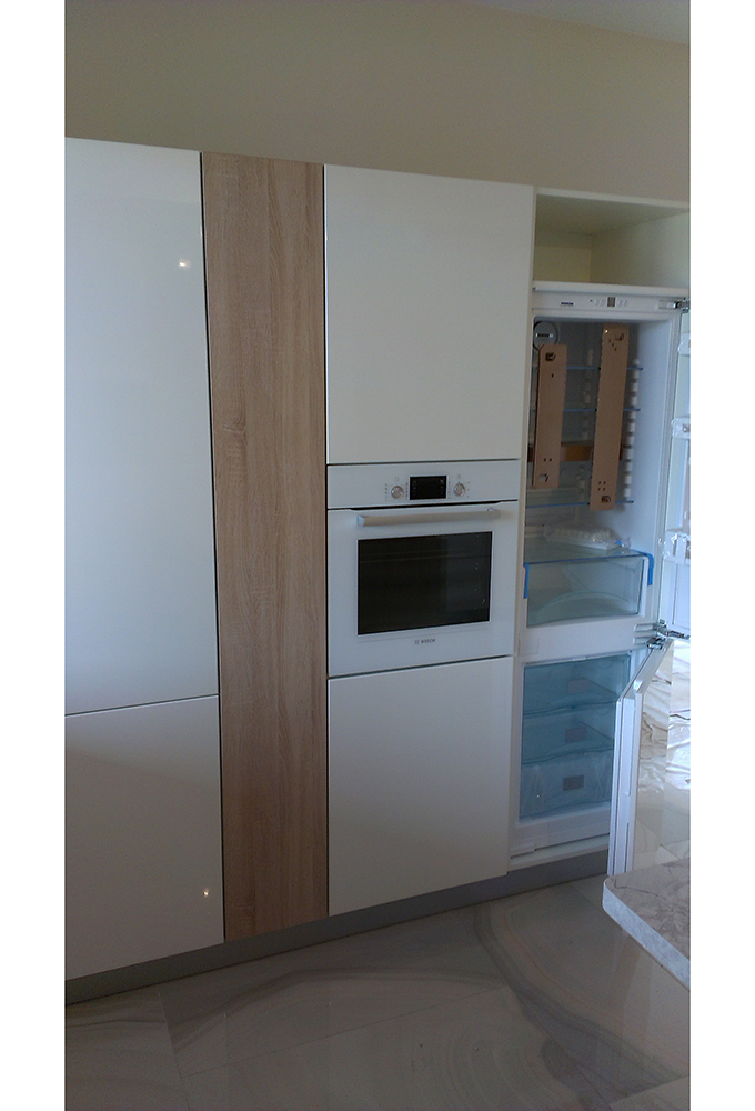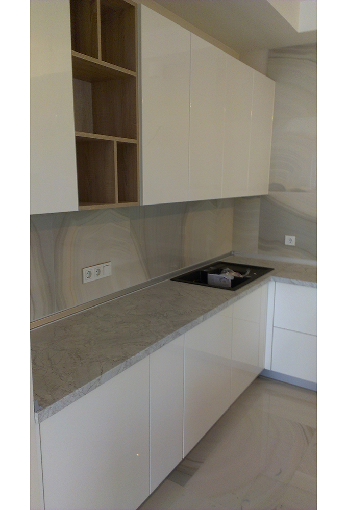 Стильная кухня в белом цвете оснащена просторной П-образной столешницы с варочной панелью. Фасады модели глянцевые, без ручек. Открытия дверок происходит при помощи системы пуш-ту-оупен, при которой необходимо нажать на дверцу, после чего она откроется. В кухне предусмотрен отдельный модуль для встраиваемой техники.