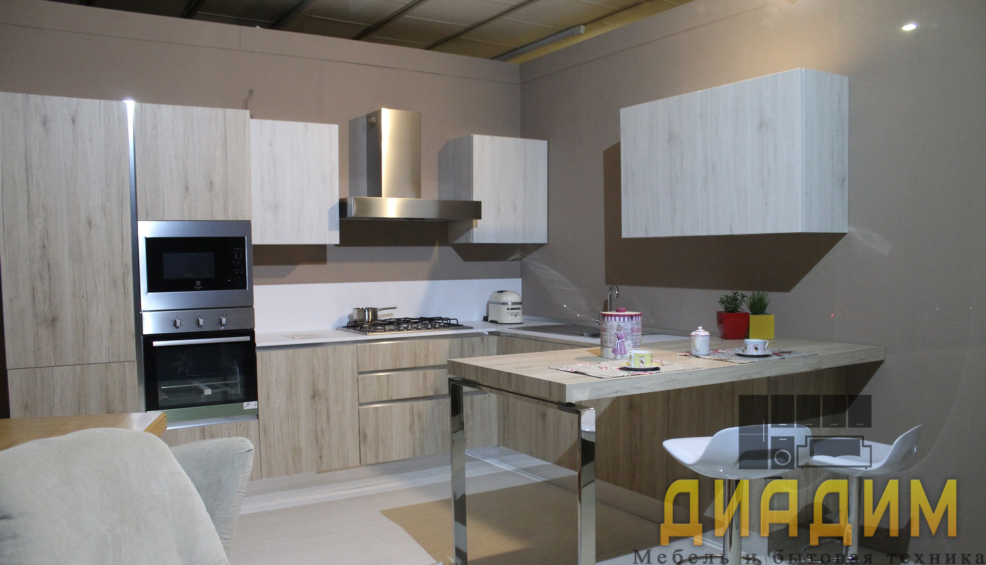 Древесный окрас фасадов в сочетании с металлической фурнитурой выглядит очень гармонично и современно. Дизайн модульной конструкции смотрится минималистично. Столешница рассчитана на четыре персоны. Она с двумя навесными шкафами посередине акцентирует внимание.
