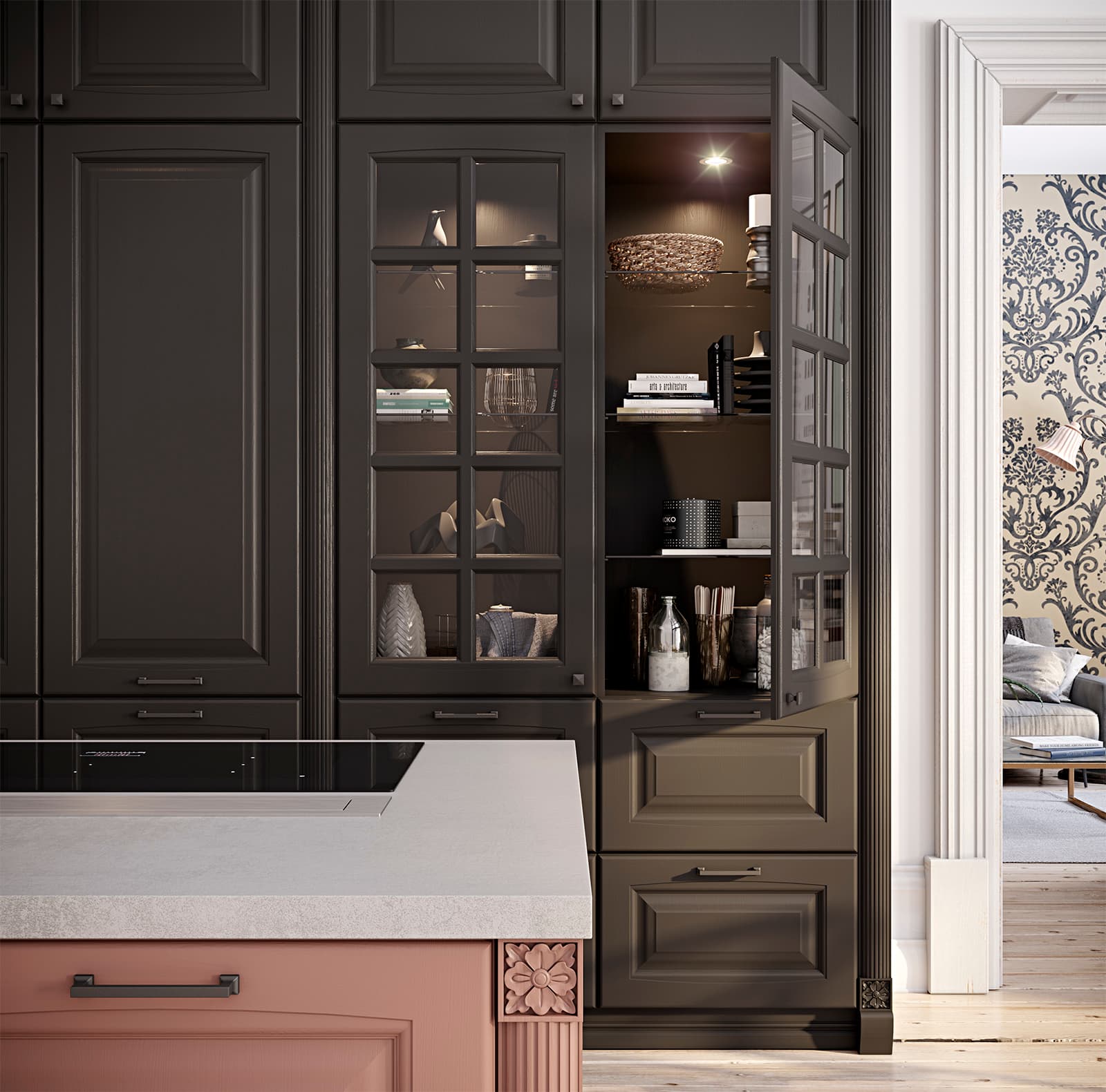 Монолитные шпонированные фасады, отсутствие ручек, четкая геометрия.