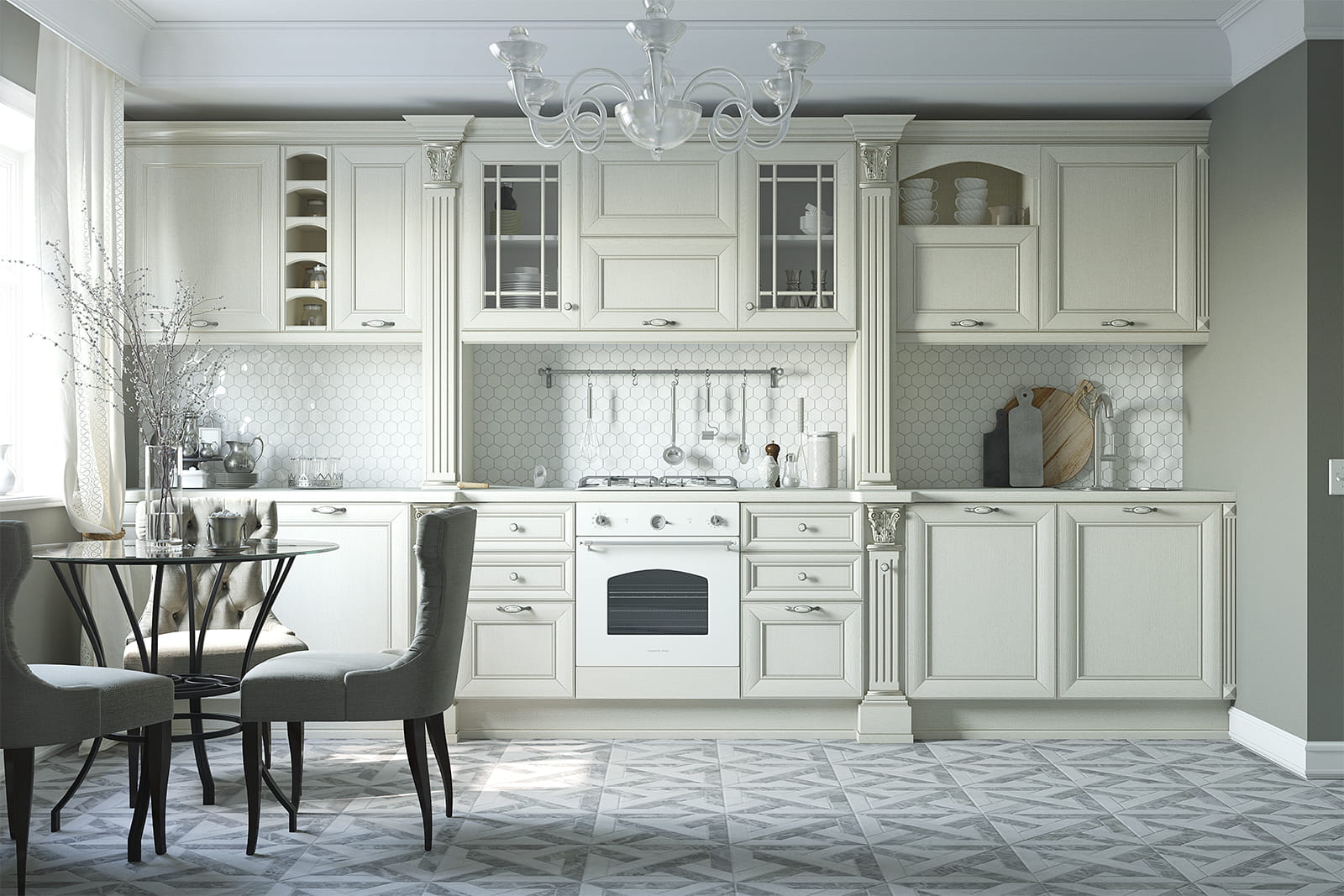 Фасады молочного цвета, открытые полки на торце гарнитура, качественные материалы.
