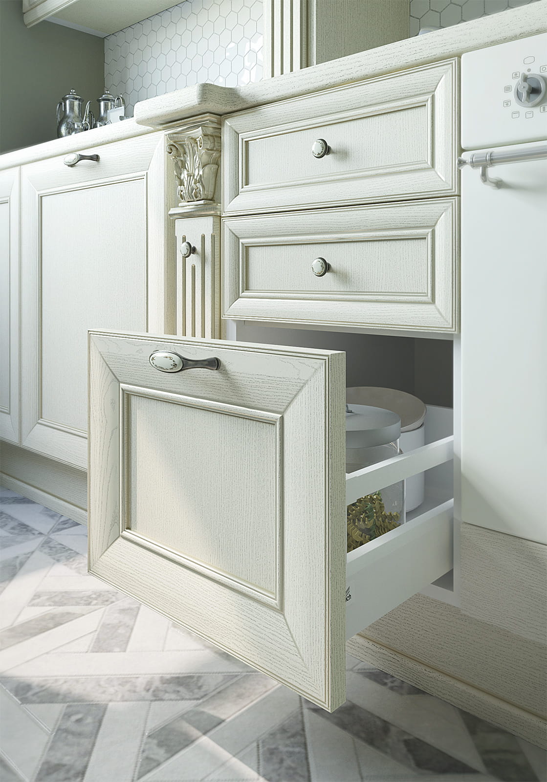 Используются покрытые эмалью фасады МДФ 19 мм с интегрированной ручкой.