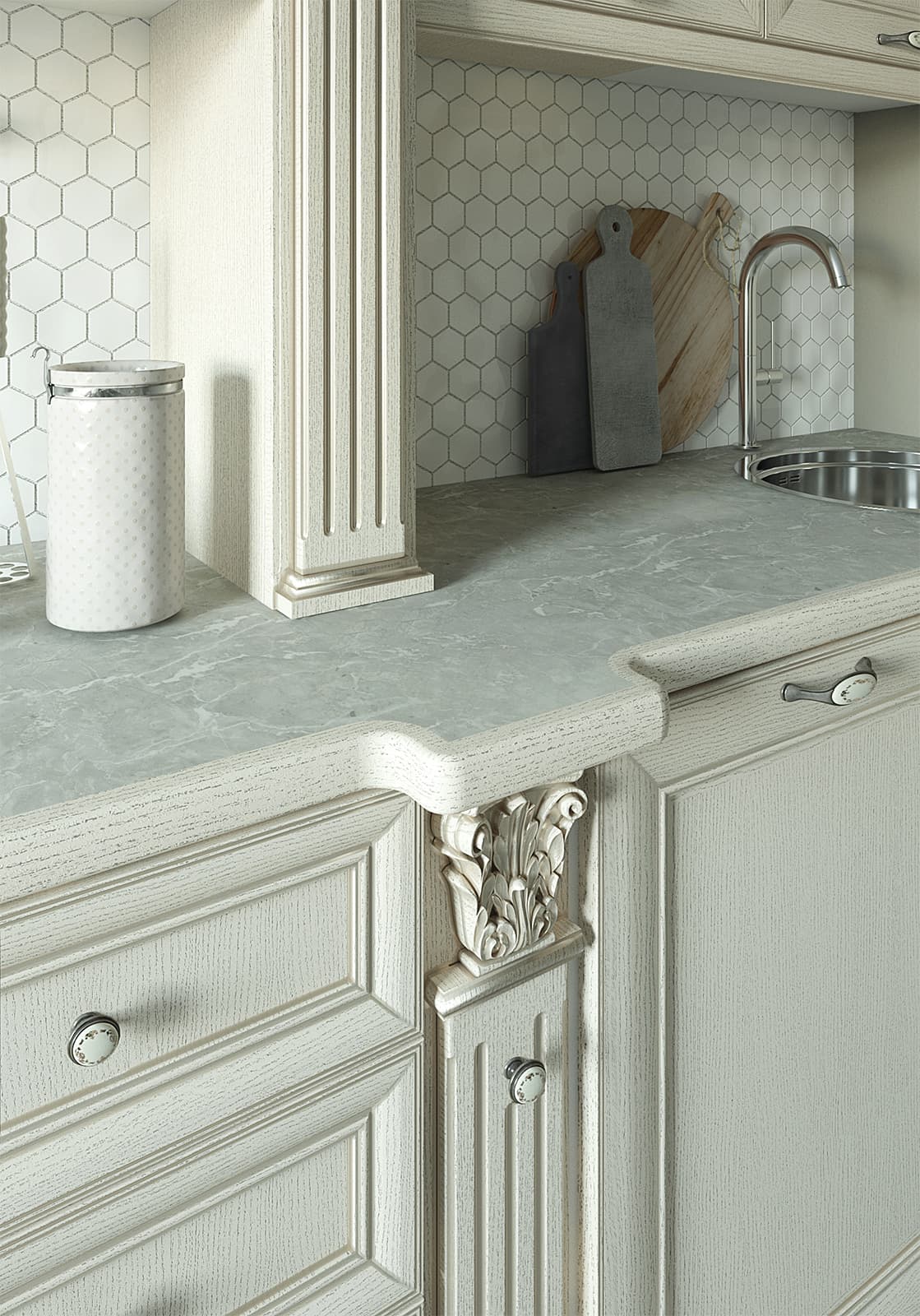Фасады т519 натуральный ясень, цвет 110 (патина шампань) столешница пластик hpl, 38 мм, цвет мрамор вальмасино светло-серый