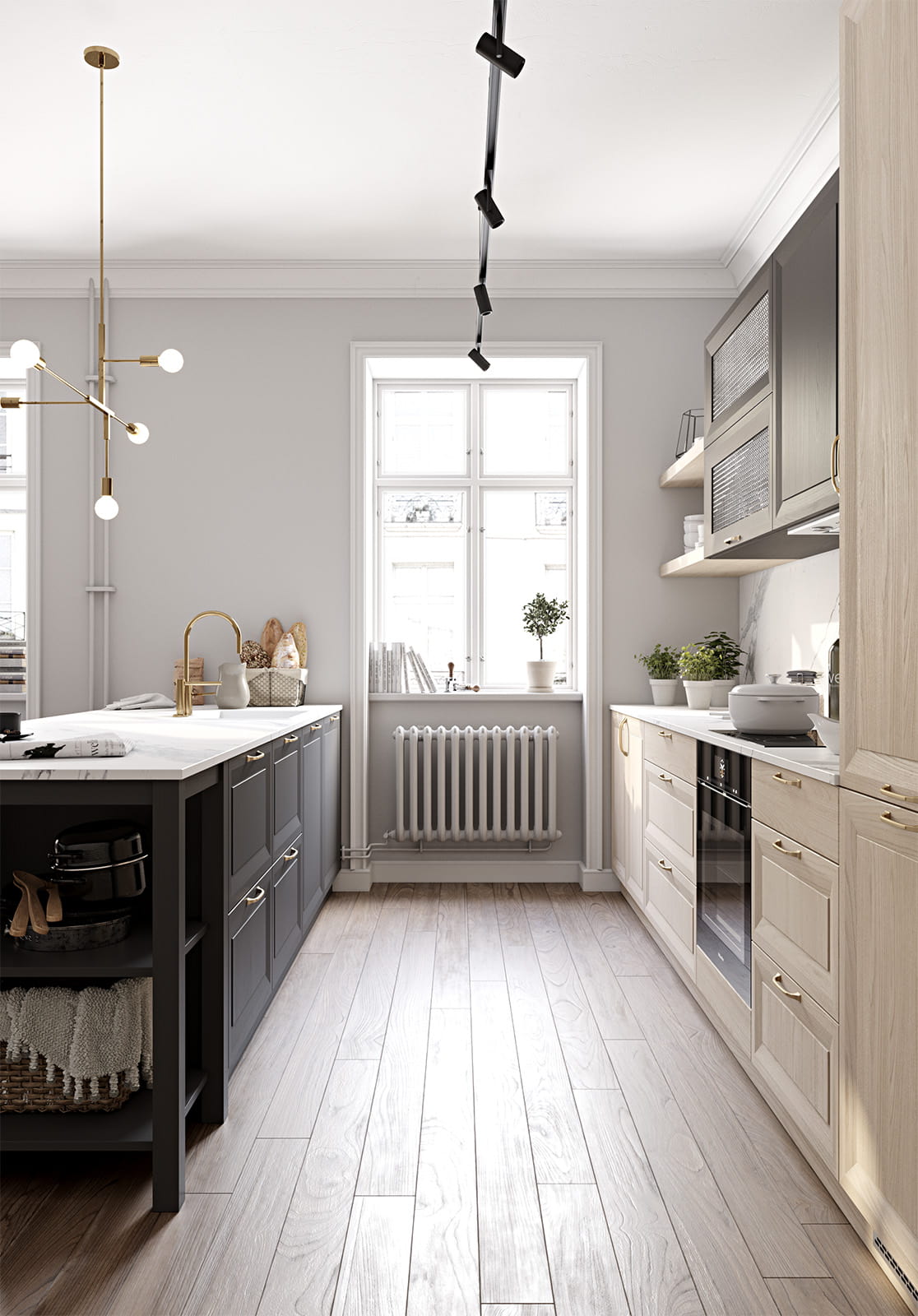 Фасады т732 натуральный дуб, цвет ncs s 5000-n / #189 воскобейц белый столешница керамогранит, 23 мм, цвет канкара