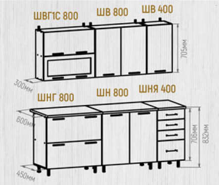 Цена указана за кухню шириной 2,0 метра, что на первом фото. В наборе шесть модулей: шкаф верхний горизонт стекло 800 мм, шкаф верхний 800 мм, шкаф верхний 400 мм, шкаф нижний горизонт 800 мм, шкаф нижний 800 мм, шкаф нижний с ящиками 400 мм).