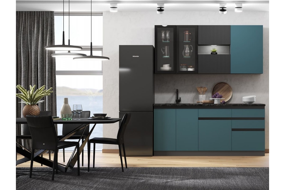 Комбинированные фасады из МДФ. Ширина кухни 220 см.