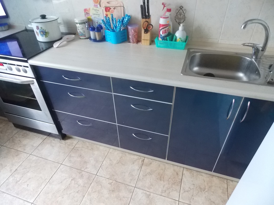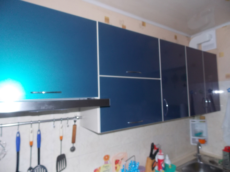 Кухня имеет линейную конструкцию, ее особенностью стал необычный цвет фасадов – темно-бирюзовый. Ударопрочная столешница устойчива к воздействию влаги и бытовой химии. Фасады изготовлены из пластика, комплектуются надежными металлическими ручками.