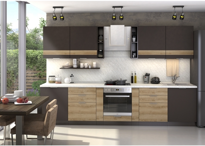 Кухня матовая Терра Soft - 01. Контрастные вставки придают законченность композиции. В представленный набор входит мебель для кухни, столешница, нижние цоколи, закрывающие опоры столов спереди. При желании, вы можете дополнить композицию новыми модулями из коллекции или заменить представленную мебель на другие размеры и функциональные элементы. Материал задних стенок - ДВП в цвет каркаса. Ручки - профильная, 146мм, светлая. Опоры - Регулируемые, закрытые цоколем в цвет каркаса.