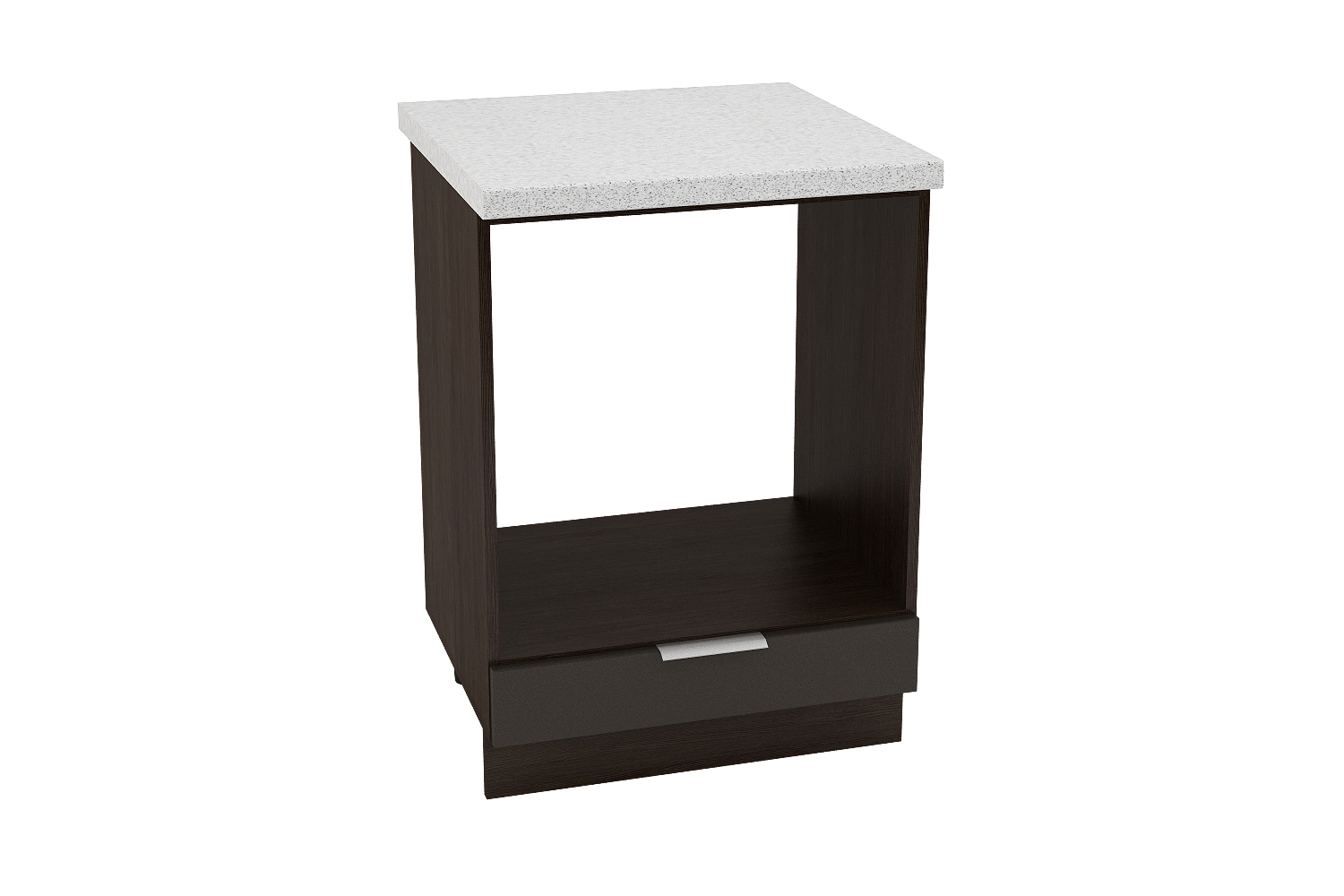 Темная столешница под мрамор, черные стекла и матовые ручки.