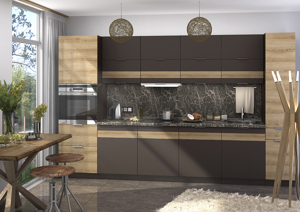 Кухня длиной 260 см. Сочетание яркого и темного цвета фасадов.