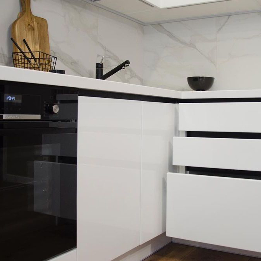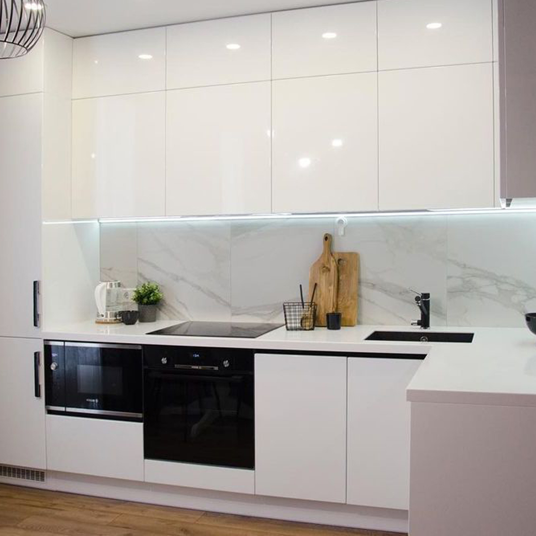 Функциональная минималистичная кухня с островом. Фасады без ручек из пластика.