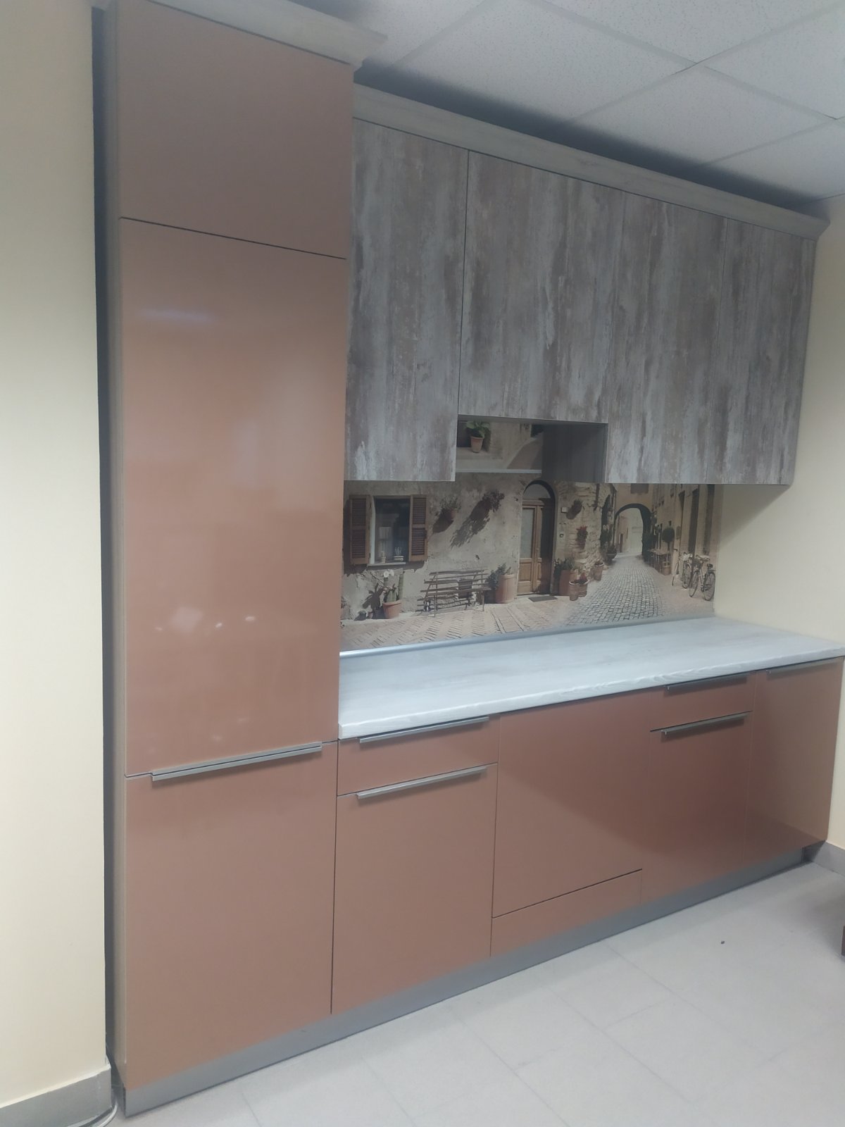 Современная линейная кухня. Разные цветовые решения фасадов и столешницы.