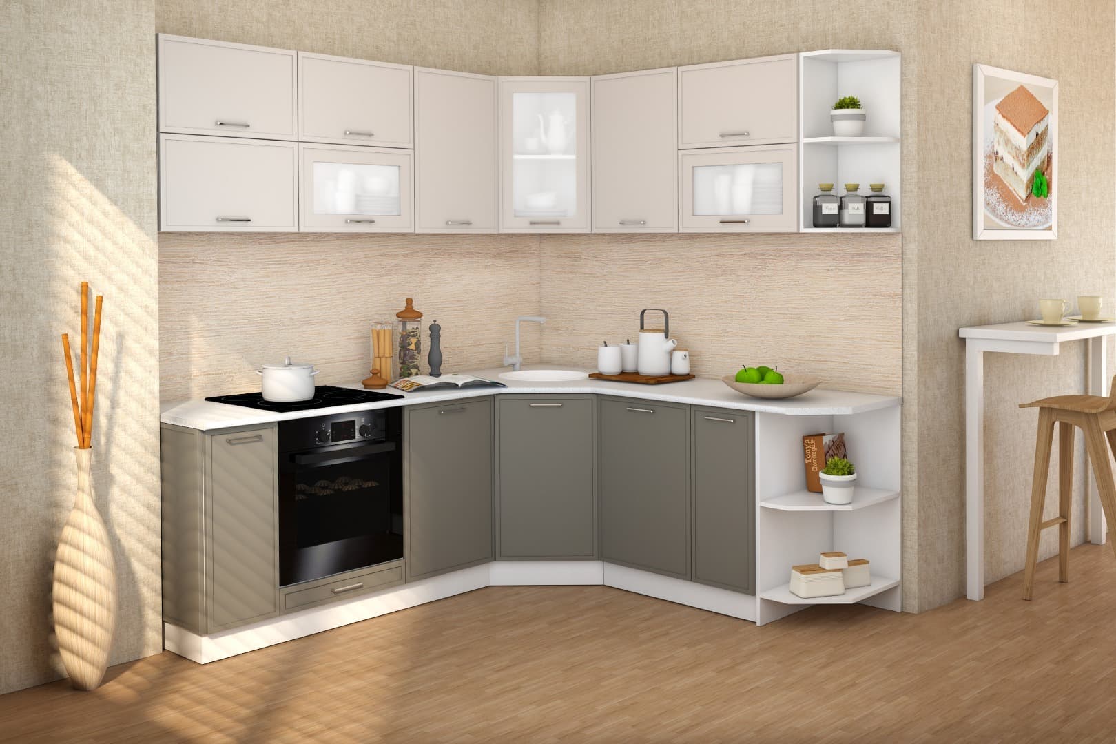 Угловая кухня 150х180 см со вставками стекла в навесных шкафах.