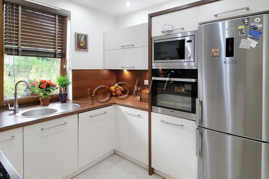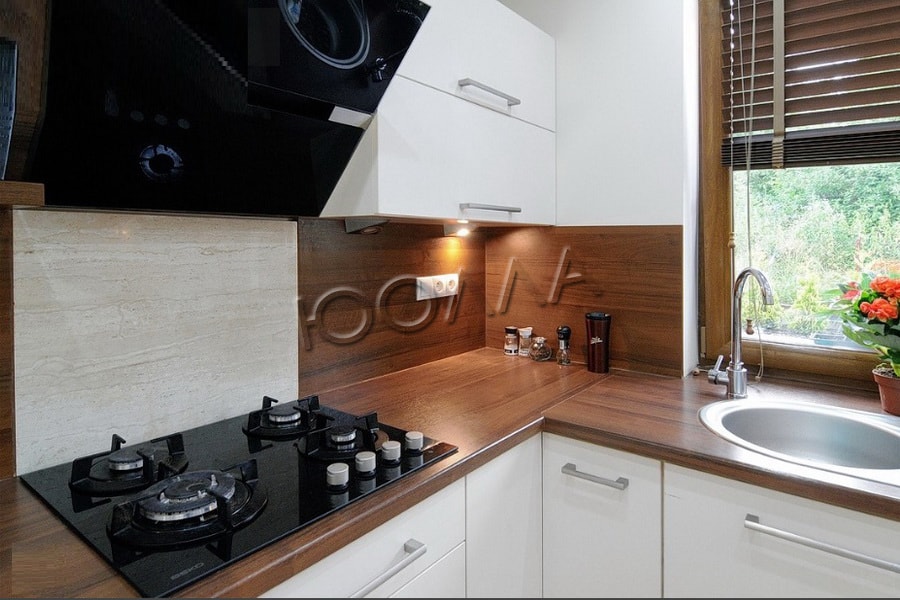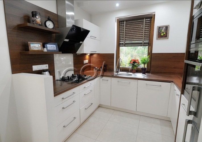 код 89717Кухня в скандинавском стиле: белые фасады и рыжая столешница под дерево - один из популярных вариантов оформления.