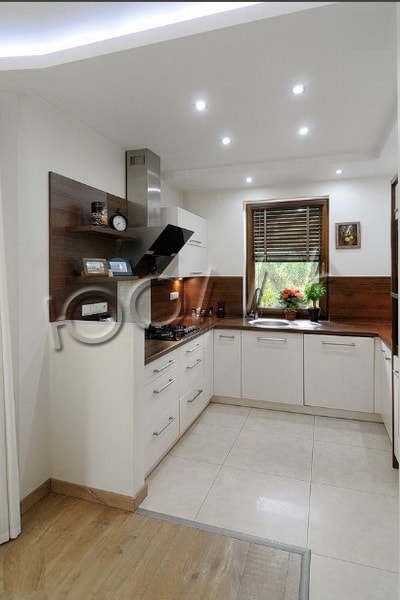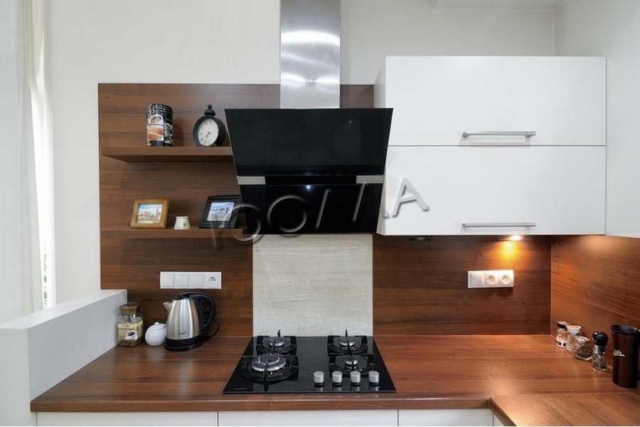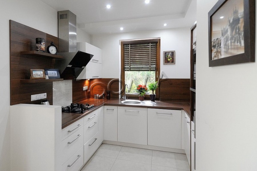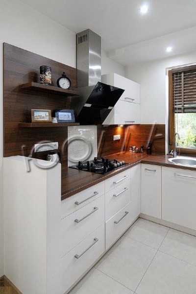 Современная П-образная кухня в скандинавском стиле с глянцевыми белыми фасадами в контраст фартуку и столешнице под темный орех. Дефицит пространства легко устранен компактным навесным модулем на две ниши с подъемными дверцами и бескаркасными полками. Удобный буфет оборудован местом для встроенной кухонной техники и нишей для стандартного холодильника.