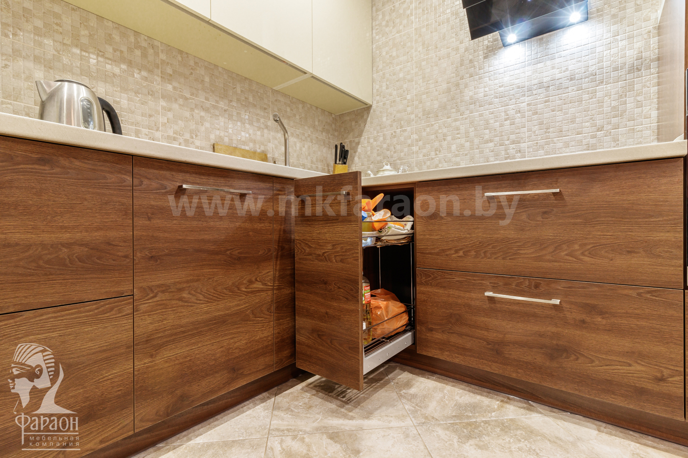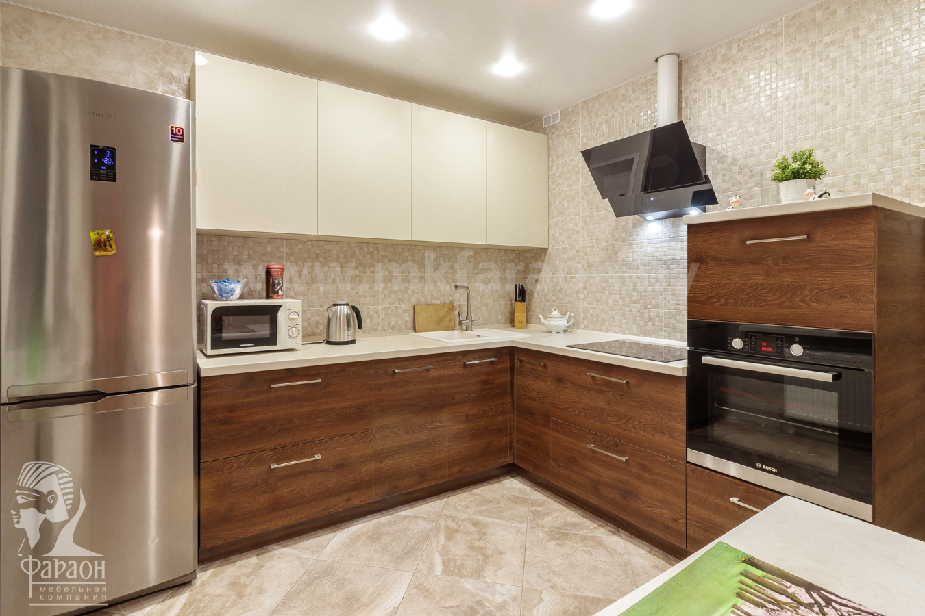 Угловая кухня с большим пеналом. Подсветка. Подвесные верхние шкафы.