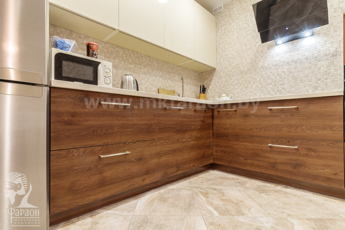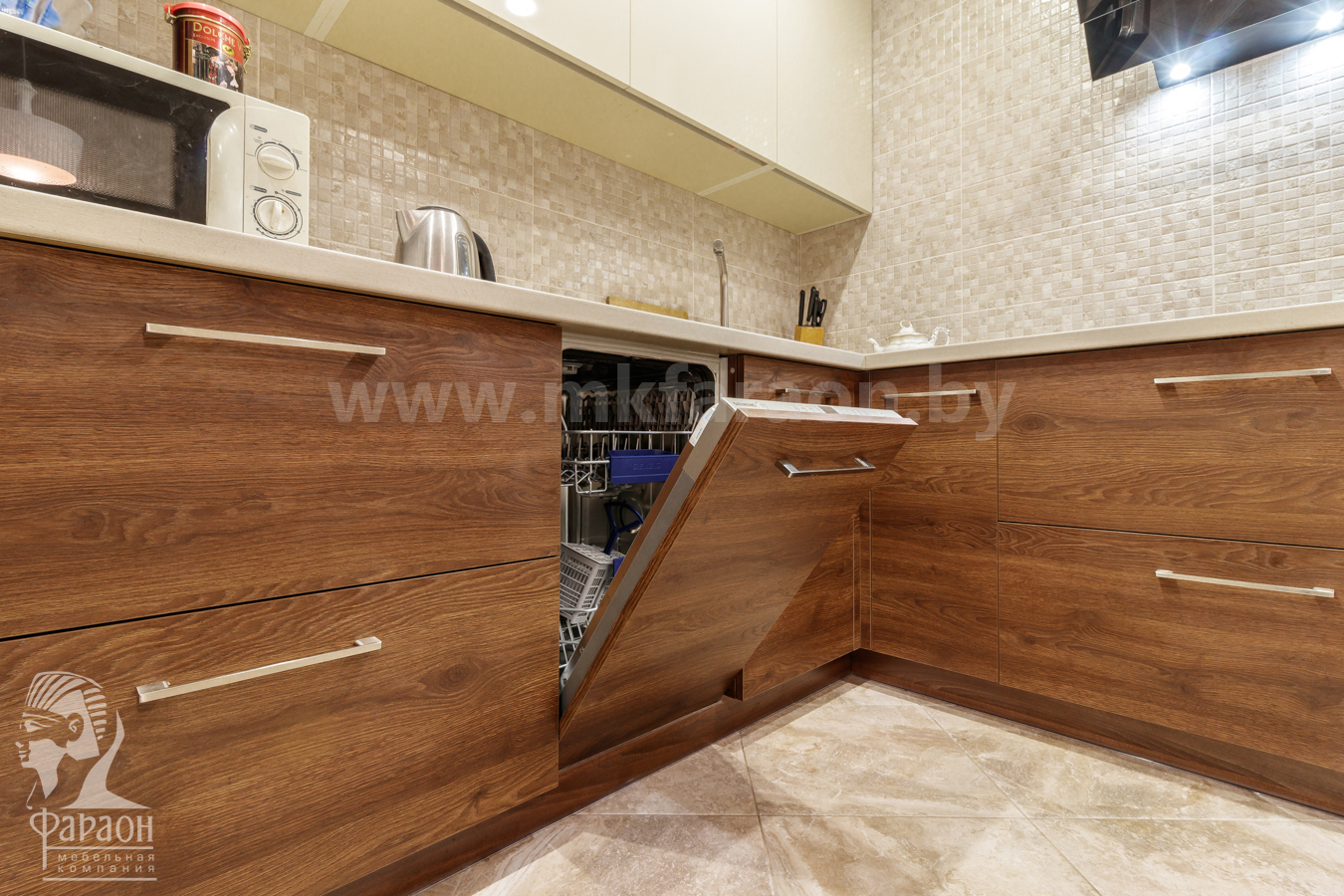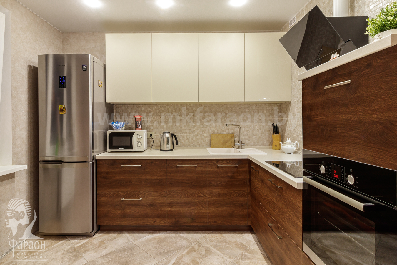 Однотонный древесный цвет фасадов из ЛДСП. Ширина кухни 140 см.