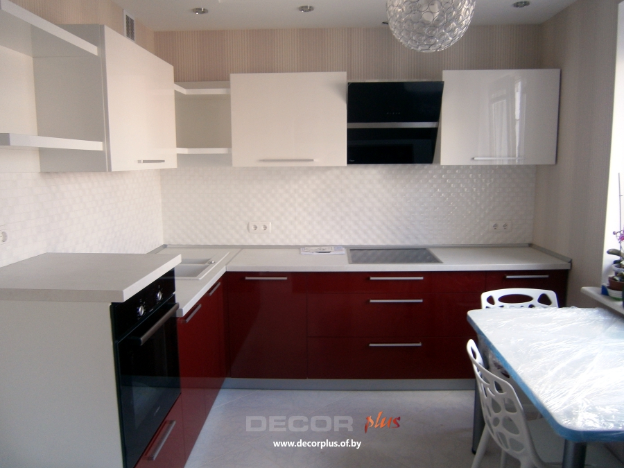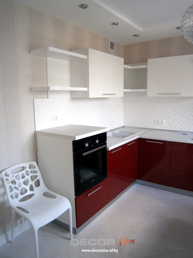 Глянцевый угловой кухонный гарнитур: белый верх, темно-красный бордовый низ. В верхнем фасаде равномерно чередуются открытые полки и закрытые прямоугольные навесные модули. Низ с белой столешницей и духовым шкафом. На дверцах и выдвижных ящиках металлические ручки-рейлинги.