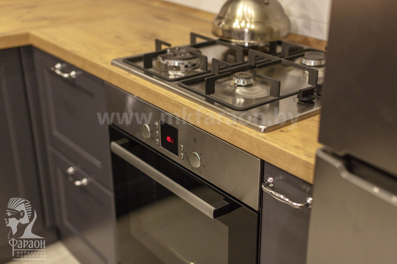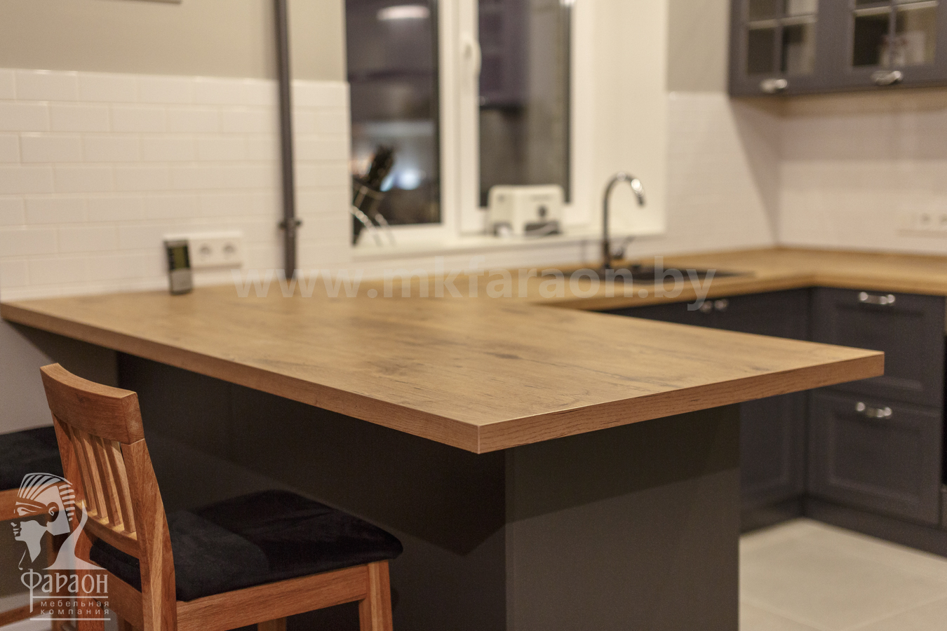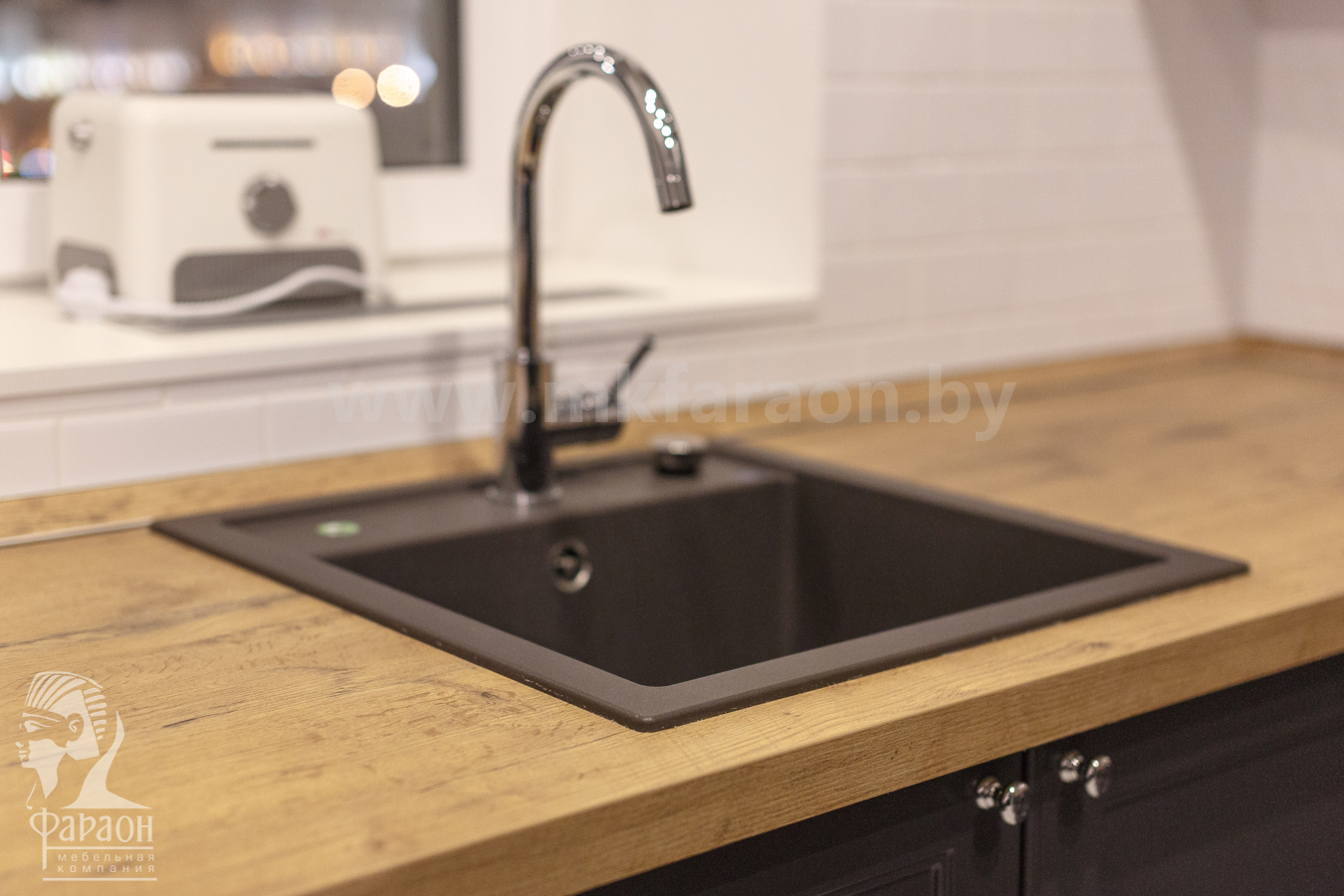 Темный цвет фасадов в тандеме с древесным оттенком столешницы.