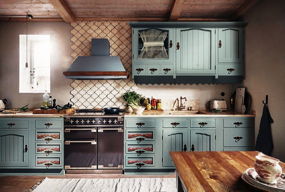 Угловая кухня Монтанья из натурального дерева с фигурной балюстрадой